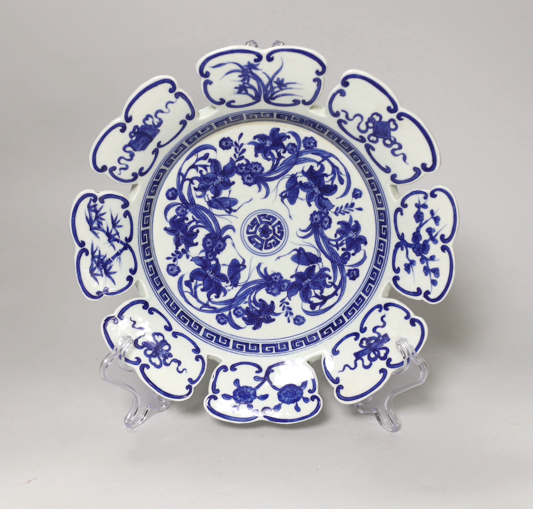 Sale: 310723A Chinese underglaze blue dish with unusual border design, 25.5cm diameter